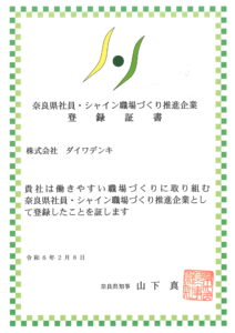 「奈良県社員・シャイン職場づくり推進企業」 へ登録いただきました。